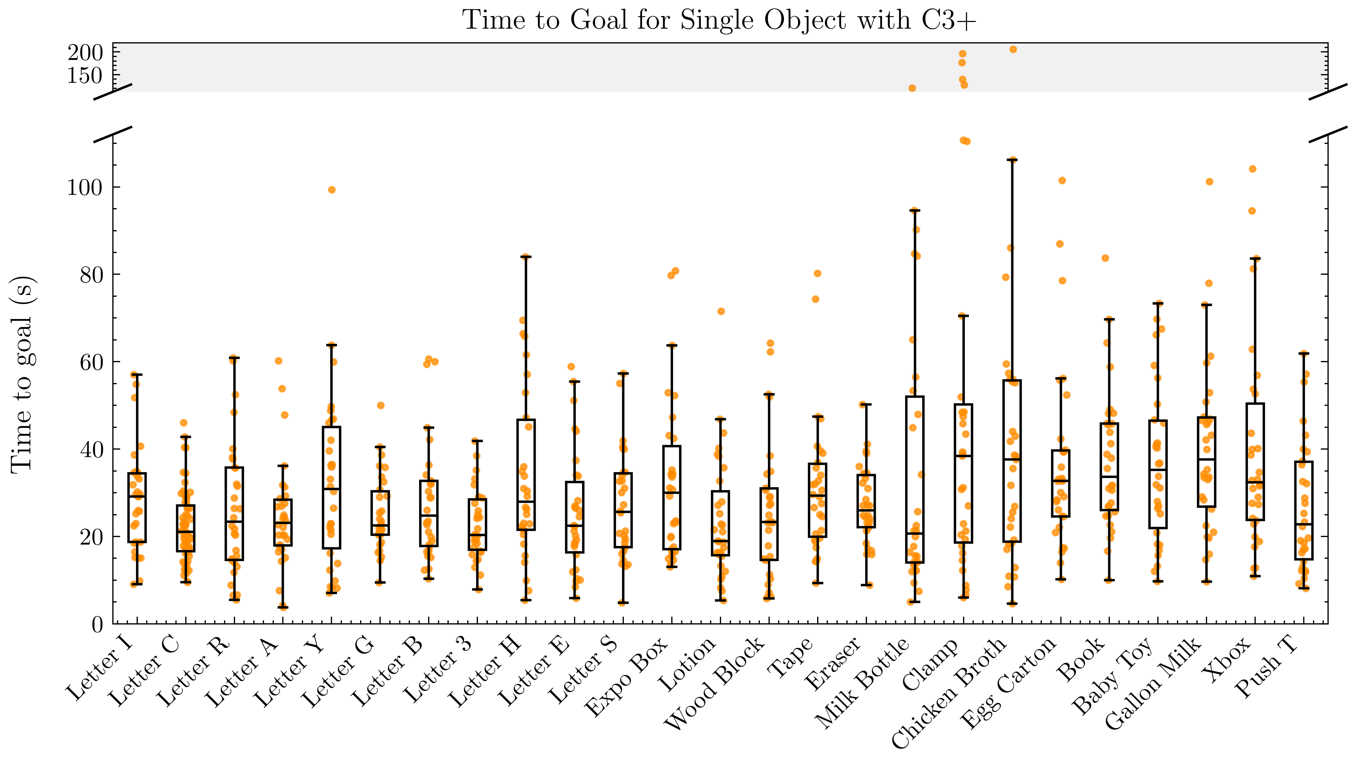 We evaluated our method in 701 hardware trials, testing 25 objects, with each object run until 28 successful trials were obtained. The system achieved a 99.9% success rate (700/701), with the only failure occurring when the large egg carton was pushed out of the robot’s reach. More details can be found in the plot below.